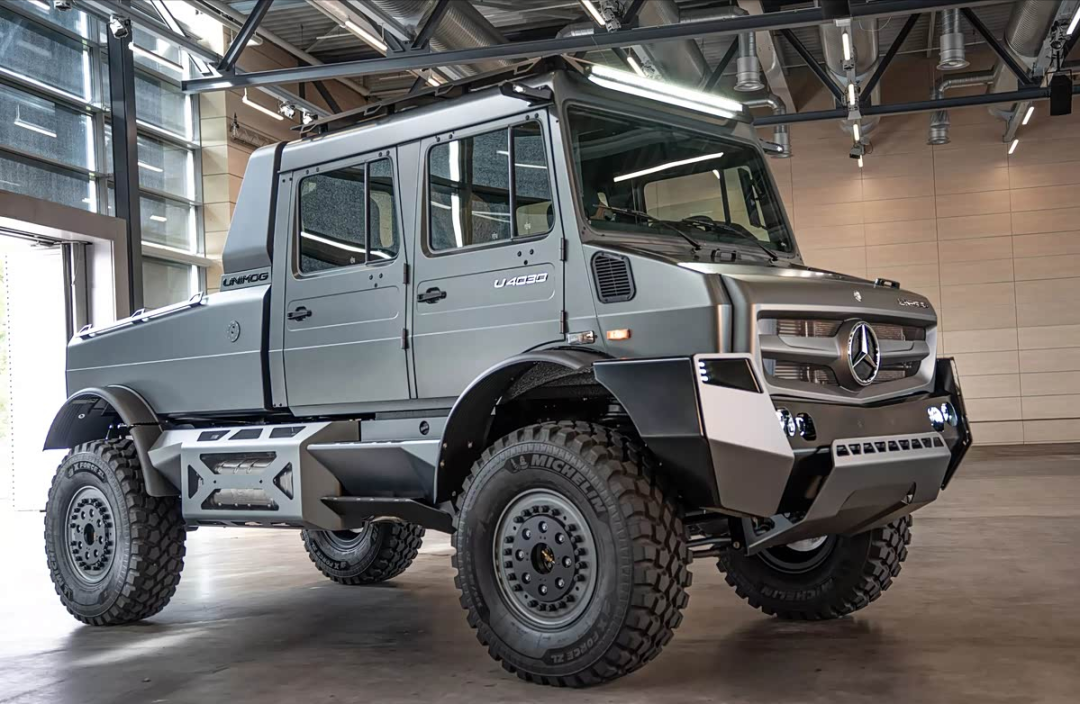 奔驰乌尼莫克U4030为纪念品牌80周年打造,基于U4023平台强化越野性能。哑光灰车漆搭配车顶探照灯与电子后视镜,货厢式四座布局凸显功能性。动力搭载300马力7.7T六缸柴油发动机,匹配全时四驱系统与三把差速锁,可应对极端路况挑战。